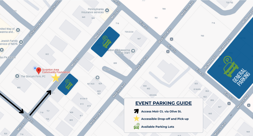 A drop-off and pick-up zone will be available on Moir Court for guests who prefer to be dropped off closer to the entrance. Vehicles should enter Moir Court via Olive Street. After dropping off guests, drivers can continue down Moir Court, turn right onto Pine Street, and then turn left into the general parking lot.